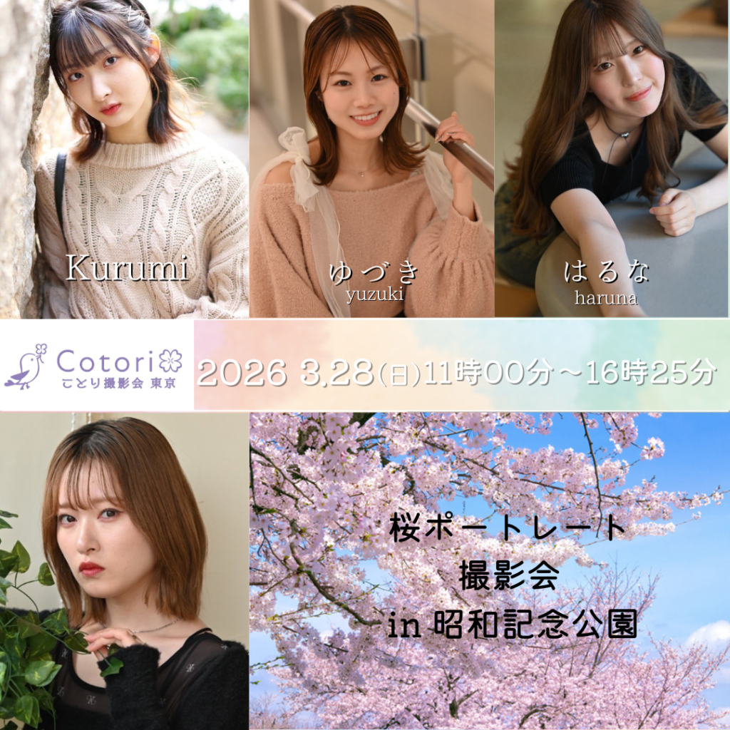 【予告】 3月28日(土)桜ポートレート撮影会 in 昭和記念公園 桜ポートレート撮影会 in 昭和記念公園 <ご予約受付開始日時> 2月27日(金) 21時~ <出演モデル> Kurumi ゆづき はるな —…